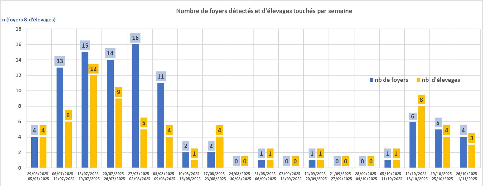 Les mesures exceptionnelles d’interdiction de rassemblements de bovins et d’interdiction d’exportation de bovins instaurées le 18 octobre ont été levées le 5 novembre. Ces mesures de restriction des mouvements bovins avaient été temporairement mises en œuvre pour éviter la diffusion de la maladie dans les territoires indemnes en France et hors France.