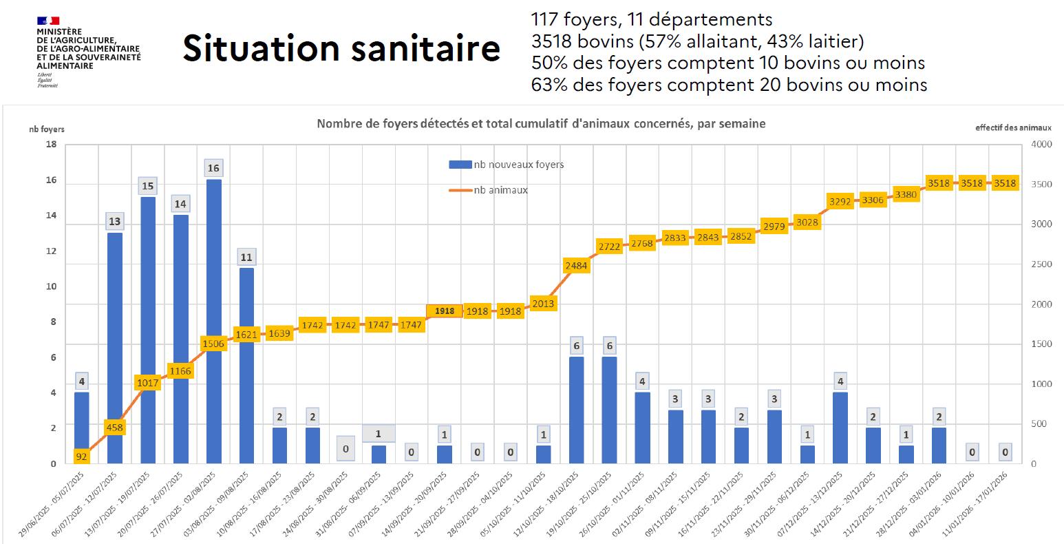 Depuis le 2 janvier 2026, aucun foyer n’est déclaré, la France comptabilise un total de 117 foyers (82 élevages) depuis le début de la maladie le 29 juin 2025.