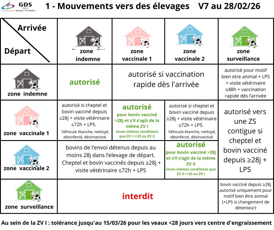 Voici un tableau récapitulatif des autorisations ou limitations de mouvements de bovin en fonction des différentes zones ( indemne, vaccinale 1, vaccinale 2 ou zone de surveillance) :