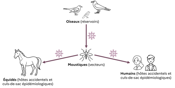 - Les chevaux et l’Homme sont des hôtes accidentels du virus, ils sont appelés « cul de sac épidémiologique » car le virus ne semble pas être en capacite de se multiplier en assez grande quantité dans le sang.